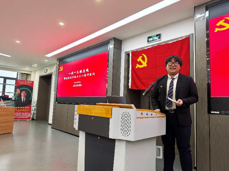 本科生第三党支部杜逸轩以“一砖一瓦凝忠魂,解读抗战中的土木人精神密码”为主题,通过抗战时期土木工程的典型案例,提炼出速度、温度、硬度三大精神密码,并倡导将其转化为新时代建设的行动力。