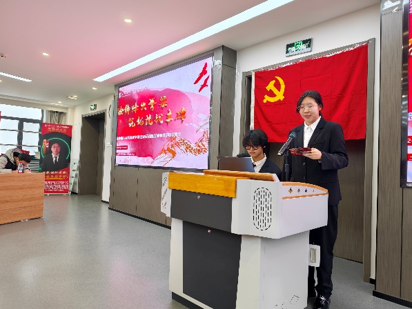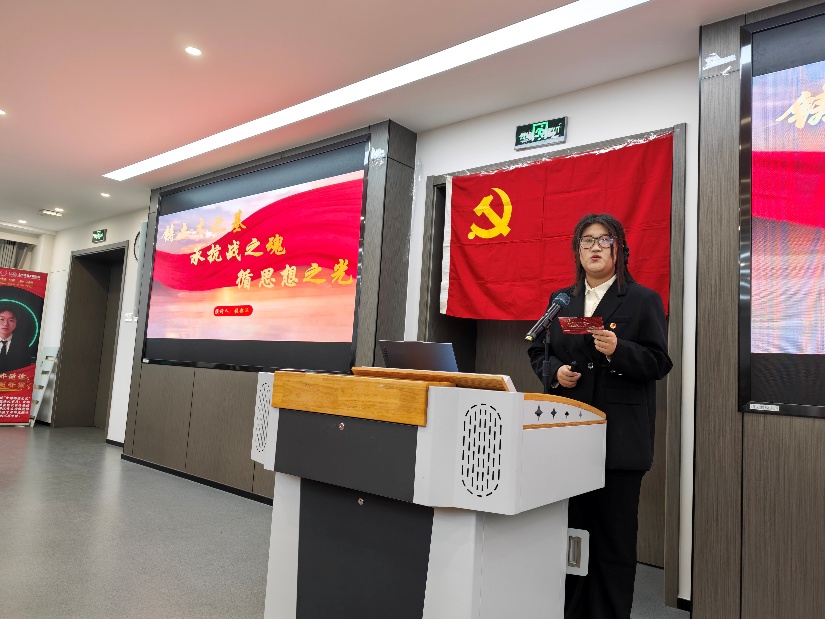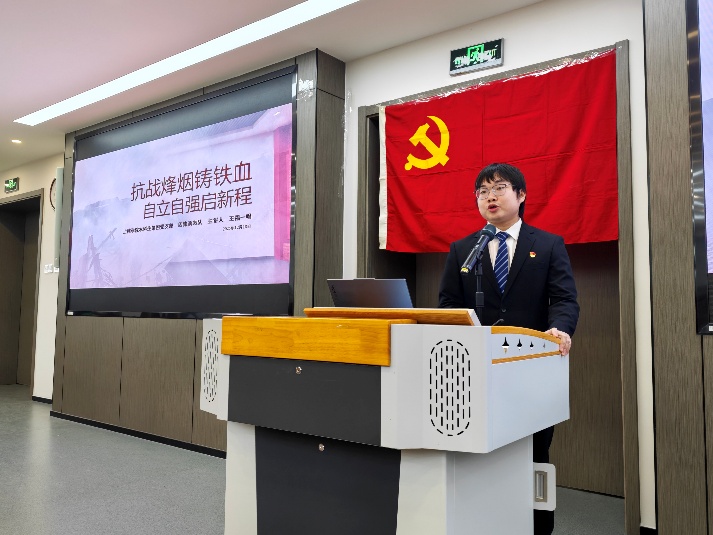 本科生第四党支部王福一唱以“抗战烽烟铸铁血,自立自强启新程”为主题,带领参会师生回顾抗战背景、历程与胜利意义,阐释抗战精神内涵,结合国家发展成就,号召新时代青年传承抗战精神、担当强国使命。